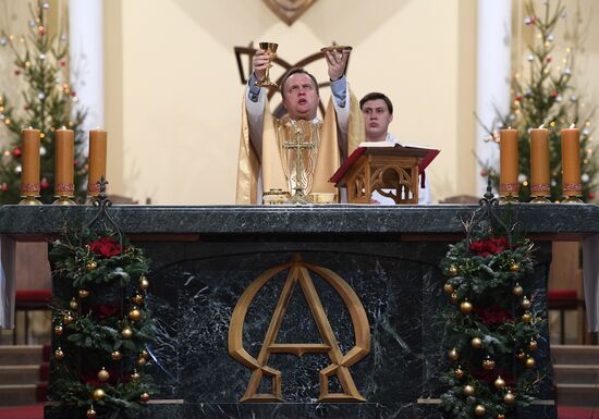 Настоятель римско-католического кафедрального собора Непорочного Зачатия Пресвятой Девы Марии Владимир Кабак во время Рождественской мессы в храме. 24.12.2019#6116113