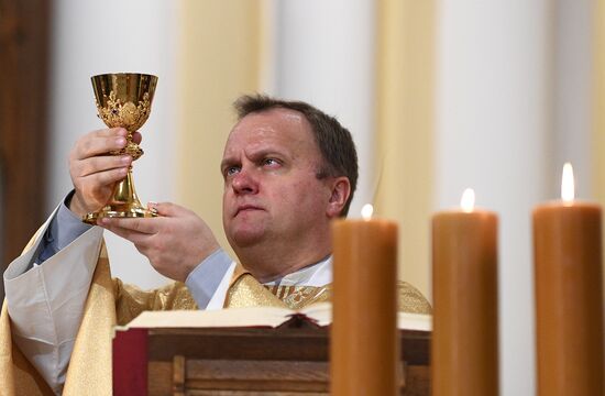 Настоятель римско-католического кафедрального собора Непорочного Зачатия Пресвятой Девы Марии Владимир Кабак во время причастия верующих на Рождественской мессе в храме.24.12.2019#6116196