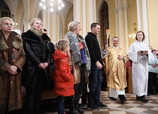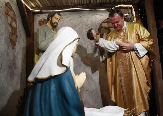 Настоятель римско-католического кафедрального собора Непорочного Зачатия Пресвятой Девы Марии Владимир Кабак во время Рождественской мессы укладывает фигурку младенца Христа в рождественские ясли.24.12.2019#6116190