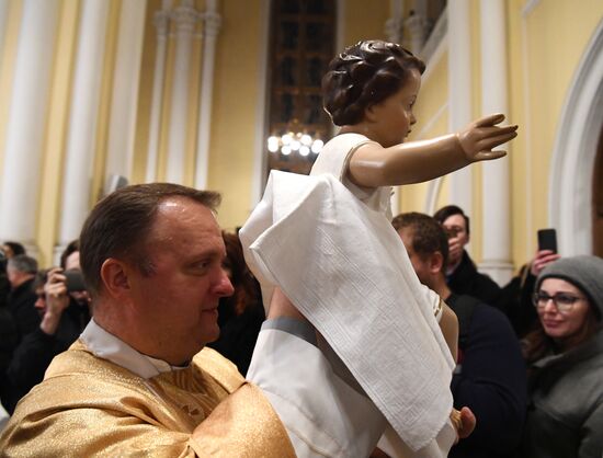 Настоятель римско-католического кафедрального собора Непорочного Зачатия Пресвятой Девы Марии Владимир Кабак во время Рождественской мессы несет фигурку младенца Христа, чтобы уложить ее в рождественски ясли.24.12.2019#6116189