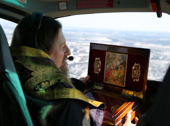 Митрополит Белгородский и Старооскольский Иоанн в вертолете во время воздушного крестного хода против коронавируса над территорией Белгородской области. Митрополит облетел регион с тремя святынями: Тихвинской иконой Божией Матери из Борисовки, иконой святого Николая Ратного из белгородского Преображенского собора и ковчегом с частицами мощей святых: с мощами Иоасафа и частицей мощей Харлампия.24.03.2020#6203811