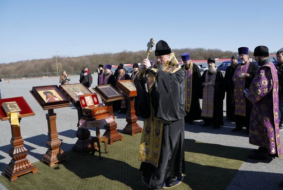 Митрополит Белгородский и Старооскольский Иоанн (справа) совершает молебен на аэродроме перед воздушным крестным ходом против коронавируса над территорией Белгородской области. Митрополит облетел регион с тремя святынями: Тихвинской иконой Божией Матери из Борисовки, иконой святого Николая Ратного из белгородского Преображенского собора и ковчегом с частицами мощей святых: с мощами Иоасафа и частицей мощей Харлампия.24.03.2020#6203859