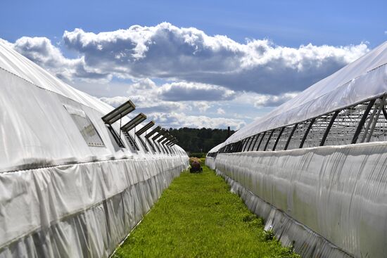 Женщина расставляет коробки с рассадой в теплице СХП "Мичуринец" в Новосибирской области.03.06.2020#6255658