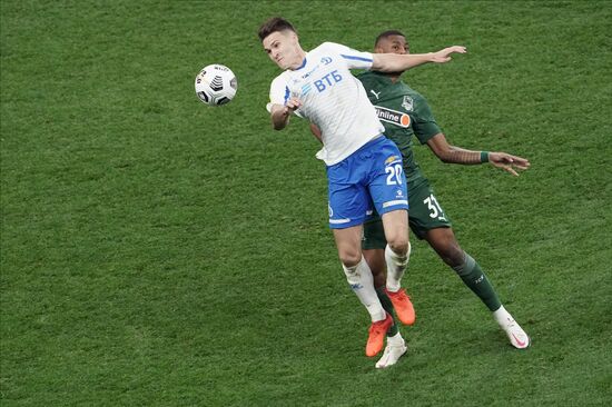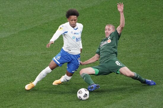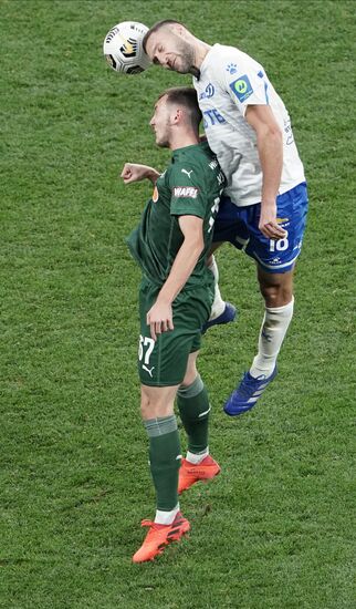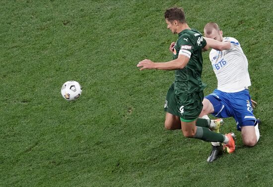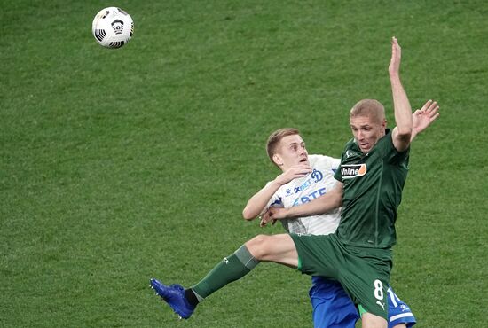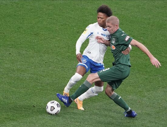 Игрок "Динамо" Даниил Фомин и игрок "Краснодара" Юрий Газинский (справа) в матче 10-го тура чемпионата России по футболу среди клубов Премьер-лиги между командами ФК "Динамо" (Москва) и ФК "Краснодар" (Краснодар).04.10.2020#6348896