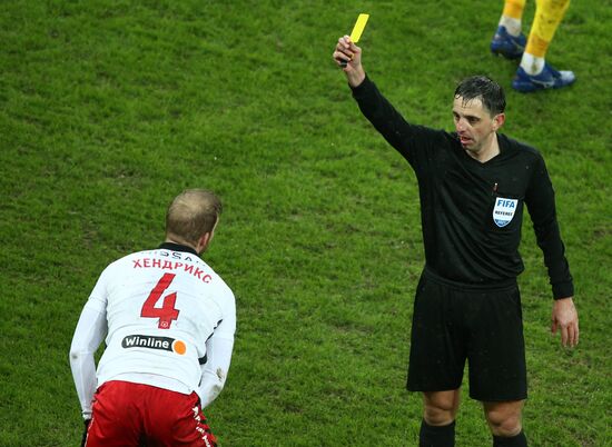 Главный судья Павел Кукуян выносит предупреждение игроку "Спартака" Йорриту Хендриксу в матче 24-го тура чемпионата России по футболу среди клубов Премьер-лиги между командами "Ростов" (Ростов-на-Дону) и "Спартак" (Москва).04.04.2021#6507106