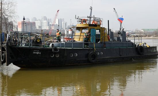 Сотрудники ГУП "Мосводосток" на буксире "Норд" во время подготовки к открытию технической навигации на Москве-реке.07.04.2021#6510424