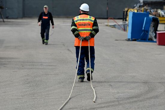 Сотрудники ГУП "Мосводосток" возле буксира "Норд" во время подготовки к открытию технической навигации на Москве-реке. 07.04.2021#6510432