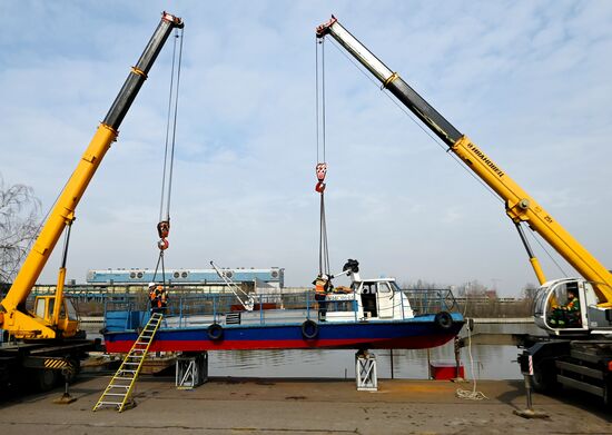 Сотрудники ГУП "Мосводосток" спускают катер на воду во время подготовки к открытию технической навигации на Москве-реке.07.04.2021#6510455