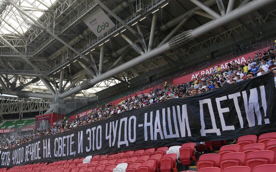 Болельщики держат плакат с надписью "Есть чудо вечное на свете, и это чудо - наши дети!" во время минуты молчания в память о погибших в результате нападения на гимназию № 175 в Казани перед началом матча 30-го тура чемпионата России по футболу среди клубов Премьер-лиги между командами ФК "Рубин" (Казань) и ФК "Ротор" (Волгоград).16.05.2021#6545863