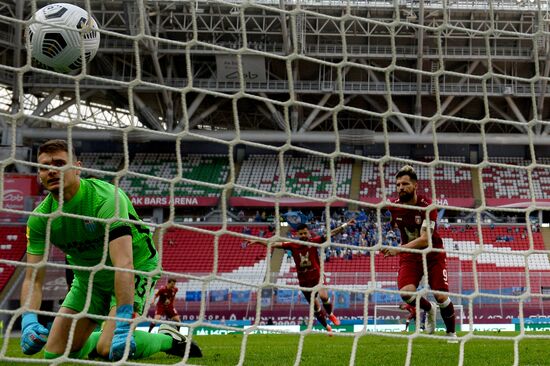 Слева: вратарь ФК "Ротор" Йосип Чондрич пропускает мяч в свои ворота в матче 30-го тура чемпионата России по футболу среди клубов Премьер-лиги между командами ФК "Рубин" (Казань) и ФК "Ротор" (Волгоград). Справа: автор гола, игрок ФК "Рубин" Джордже Деспотович.16.05.2021#6546086