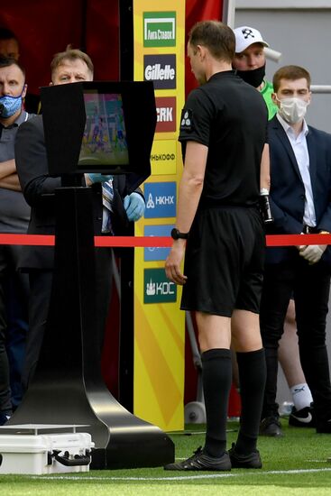 Главный судья матча Виталий Мешков смотрит видеоповтор спорного момента с использованием системы видеопомощи арбитрам (VAR) в матче 30-го тура чемпионата России по футболу среди клубов Премьер-лиги между командами ФК "Рубин" (Казань) и ФК "Ротор" (Волгоград).16.05.2021#6546123