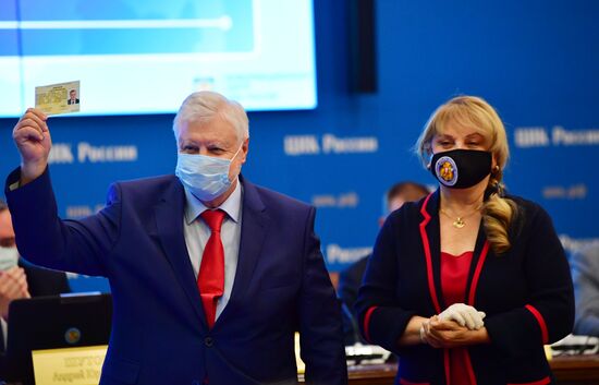 Председатель Центральной избирательной комиссии РФ Элла Памфилова и председатель объединённой политической партии "Справедливая Россия - За правду" Сергей Миронов на заседании Центральной избирательной комиссии РФ, где рассматриваются вопросы регистрации кандидатов в депутаты Госдумы РФ от партии "Справедливая Россия - за Правду" И КПРФ. Центризбирком России зарегистрировал федеральный список кандидатов партии "Справедливая Россия - За правду" для участия в предстоящих выборах депутатов Госдумы РФ.24.07.2021#6604390