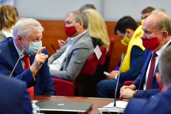 Председатель объединённой политической партии "Справедливая Россия - За правду" Сергей Миронов (слева) и председатель ЦК КПРФ Геннадий Зюганов (справа) на заседании Центральной избирательной комиссии РФ, где рассматриваются вопросы регистрации кандидатов в депутаты Госдумы РФ от партии "Справедливая Россия - за Правду" И КПРФ.24.07.2021#6604424