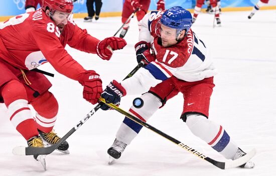 Российский спортсмен, член сборной России (команда ОКР) Никита Нестеров (слева) и игрок сборной Чехии Владимир Соботка в матче группового этапа по хоккею среди мужчин между сборными командами ОКР и Чехии на XXIV зимних Олимпийских играх 2022.12.02.2022#8112788
