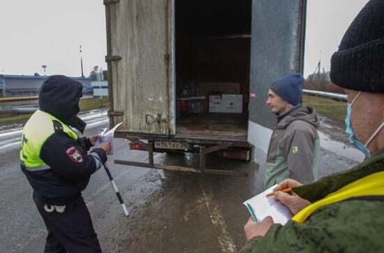 Сотрудники полиции останавливают транспорт для проверки на наличие домашних птиц в станице Новотроицкой Ставропольского края, где на территории птицефабрики ООО "Агро-плюс" был выявлен очаг птичьего гриппа. 11.02.2022#8111405
