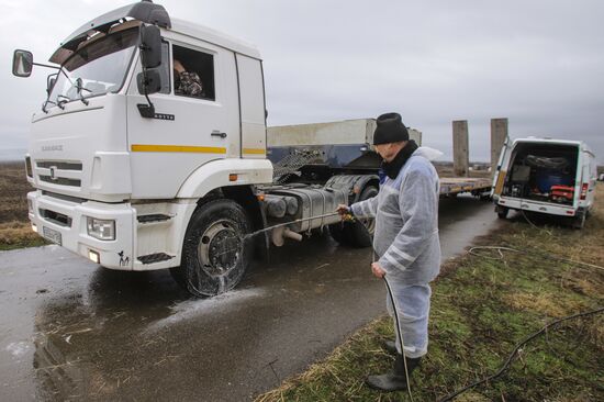 Дезинфекция транспорта в станице Новотроицкой Ставропольского края, где на территории птицефабрики ООО "Агро-плюс" был выявлен очаг птичьего гриппа. 11.02.2022#8111436