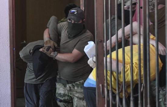 Конвоиры вводят в зал судебных заседаний в Донецке гражданина Хорватии Векослава Пребега, обвиняемого в участии в качестве наемника в боевых действиях на территории ДНР в составе украинских вооруженных формирований.15.08.2022#8253627
