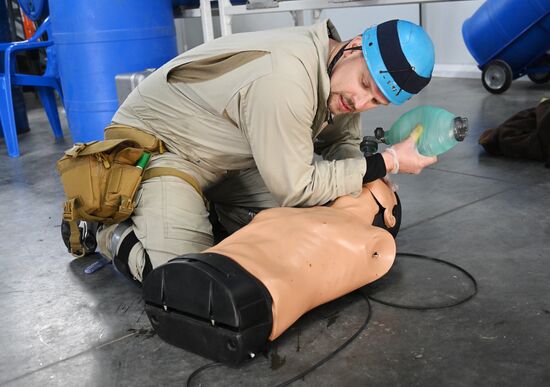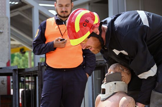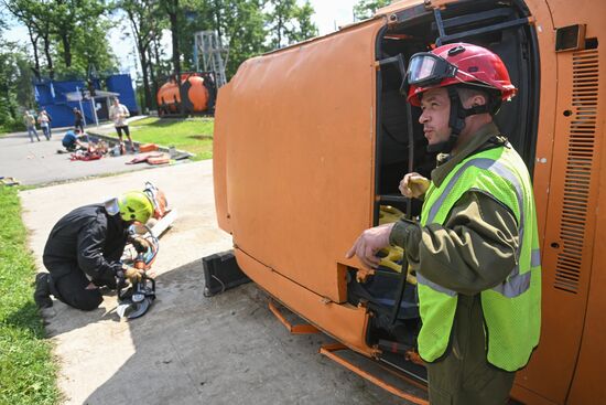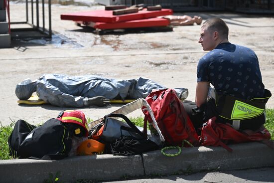 Участники городского конкурса профессионального мастерства по профессии "Спасатель" оказывает первую помощь на учебно-тренировочном полигоне в деревне Апаринки в Московской области. 29.06.2023#8469739