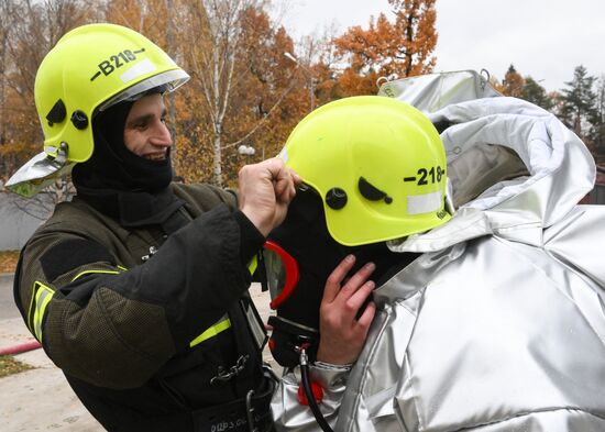 Сотрудник пожарной службы во время тренировки на учебной площадке Департамента по делам гражданской обороны, чрезвычайным ситуациям и пожарной безопасности города Москвы (ДГОЧСиПБ) в Московской области.25.10.2023#8542731