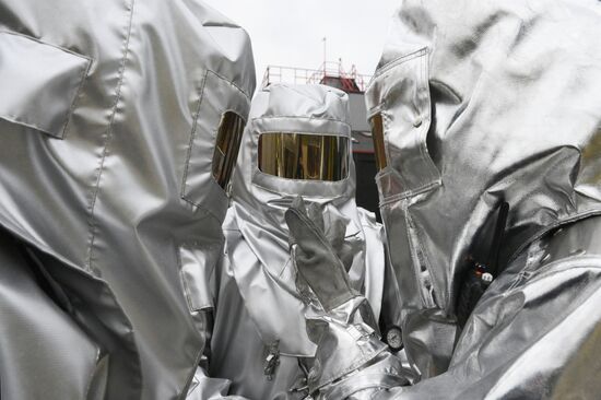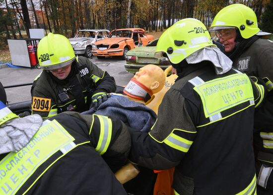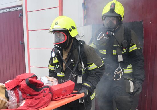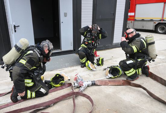 Пожарные и спасатели во время тренировки на учебной площадке Департамента по делам гражданской обороны, чрезвычайным ситуациям и пожарной безопасности города Москвы (ДГОЧСиПБ) в Московской области.25.10.2023#8542729