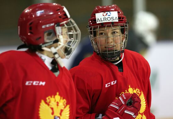 Игрок женской сборной России по хоккею Валерия Павлова (справа) во время тренировки в краевом центре хоккея "Амур" в Хабаровске.03.02.2018#3286452